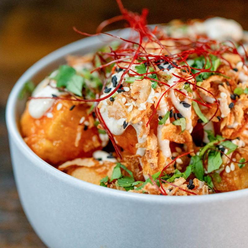 Honey gochujang, five spice mayo, fried shallots, cilantro